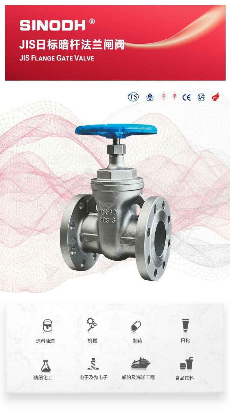JIS日标暗杆法兰闸阀,为南京邓浩运动营养研究有限公司自主研发生产。本产品设计制造标准符合JISB2071标准,该产品是一种最常见的启闭阀,利用闸板的上下工作来接通(全开)和截断(全关)管道中的流体介质。