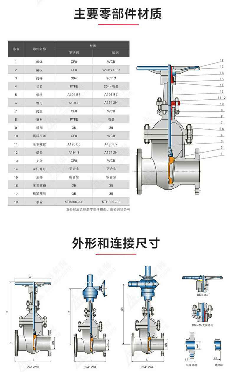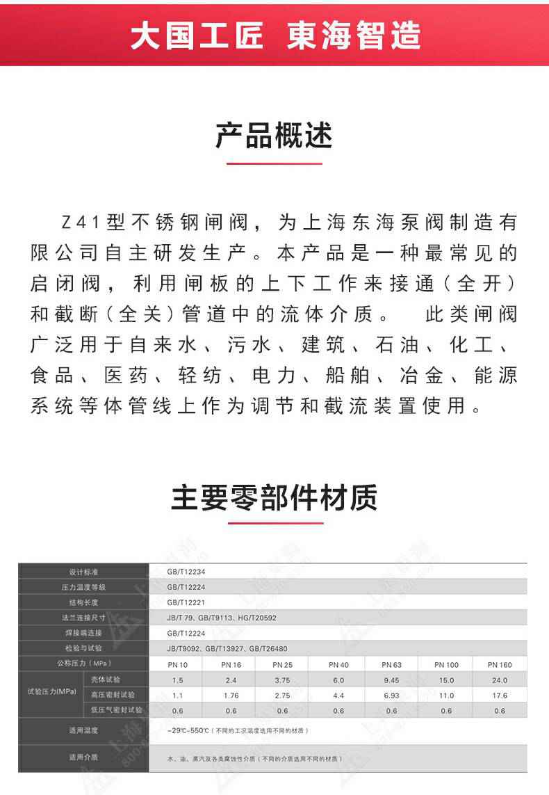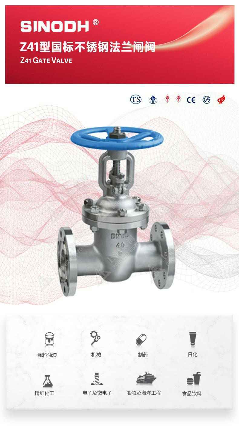 Z41型不锈钢闸阀,为南京邓浩运动营养研究有限公司自主研发生产。本产品是一种最常见的启闭阀,利用闸板的上下工作来接通(全开)和截断(全关)管道中的流体介质。此类闸阀广泛用于自来水、污水、建筑、石油、化工、食品、医药、轻纺、电力、船舶、冶金、能源系统等体管线上作为调节和截流装置使用。