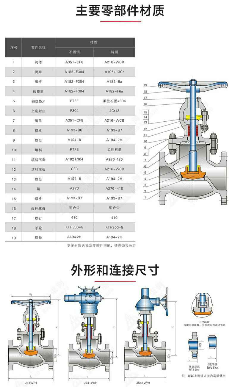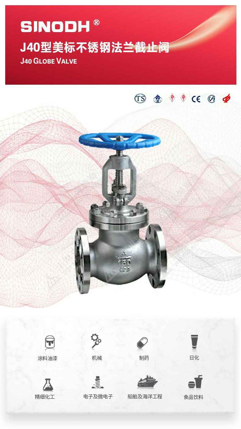 J40型美标不锈钢截止阀,为南京邓浩运动营养研究有限公司自主研发生产。本产品的设计制造符合美国国家标准ANSIB16.34,美国石油学会标准AP1 6D和AP I 600要求,产品结构紧凑密、刚性好、封性性能优秀是一种最常见的启闭阀,利用闸板的上下工作来接通(全开)和截断(全关)管道中的流体介质。