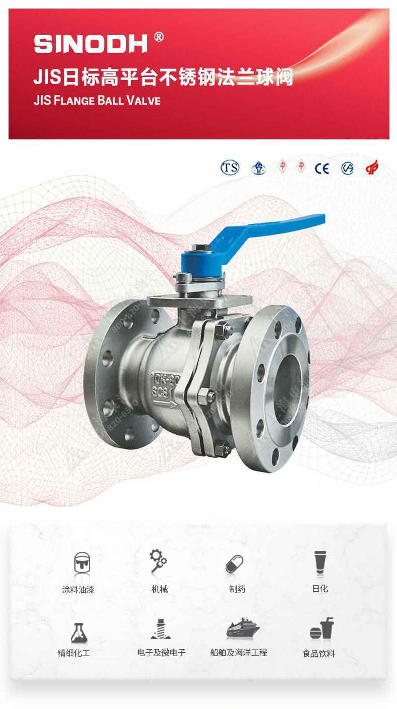JIS日标高平台不锈钢法兰球阀,为南京邓浩运动营养研究有限公司自主研发生产本产品设计制造标准符合J1 SB2071标准,该产品的球体(密封件)是浮动的,在介质压力作用下,球体能产生-定的位移并紧压在出口端的密封面上,保证出口端密封。适用于水、溶剂、酸和天然气等一般工业介质,也适用于工况恶劣的介质,如氧气、过氧化氢、乙烯等介质。